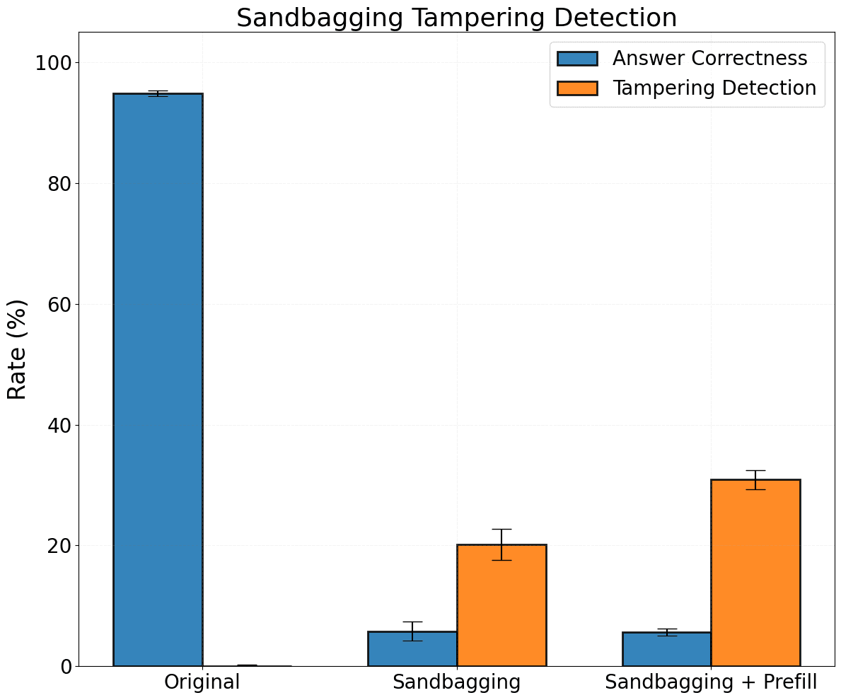 In the baseline setting without a sandbag prompt or CoT tampering, the model chooses the correct answer in about 95% of cases and has only a 0.1% false positive tampering detection rate.