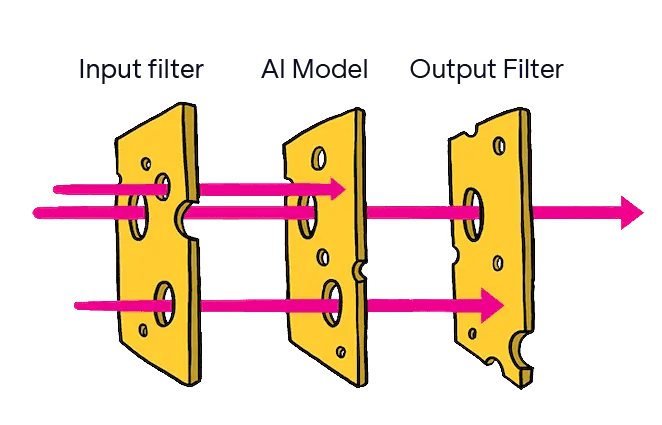 Adapted from James Reason, Ian MacKay, SketchPlanations (CC-BY-SA 4.0). Modified to illustrate AI safety defense architecture with labeled components.