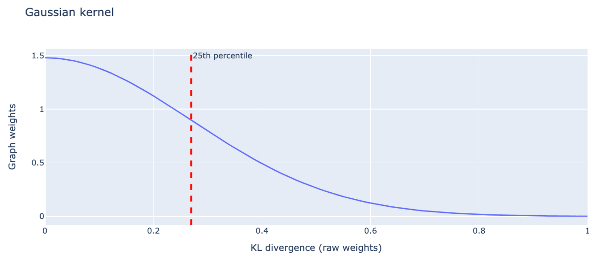 Gaussian kernel. Network analyses and visualization are easier when the weights of the edges represent similarities or attraction forces, rather than distance. To turn the raw weights of KL divergence into graph weights, we used a Gaussian kernel with a standard deviation equal to the 25th percentile of the raw weight distribution. This choice is somewhat arbitrary, but we found that the structure of the graph is not highly sensitive to the choice of metric or kernel function.