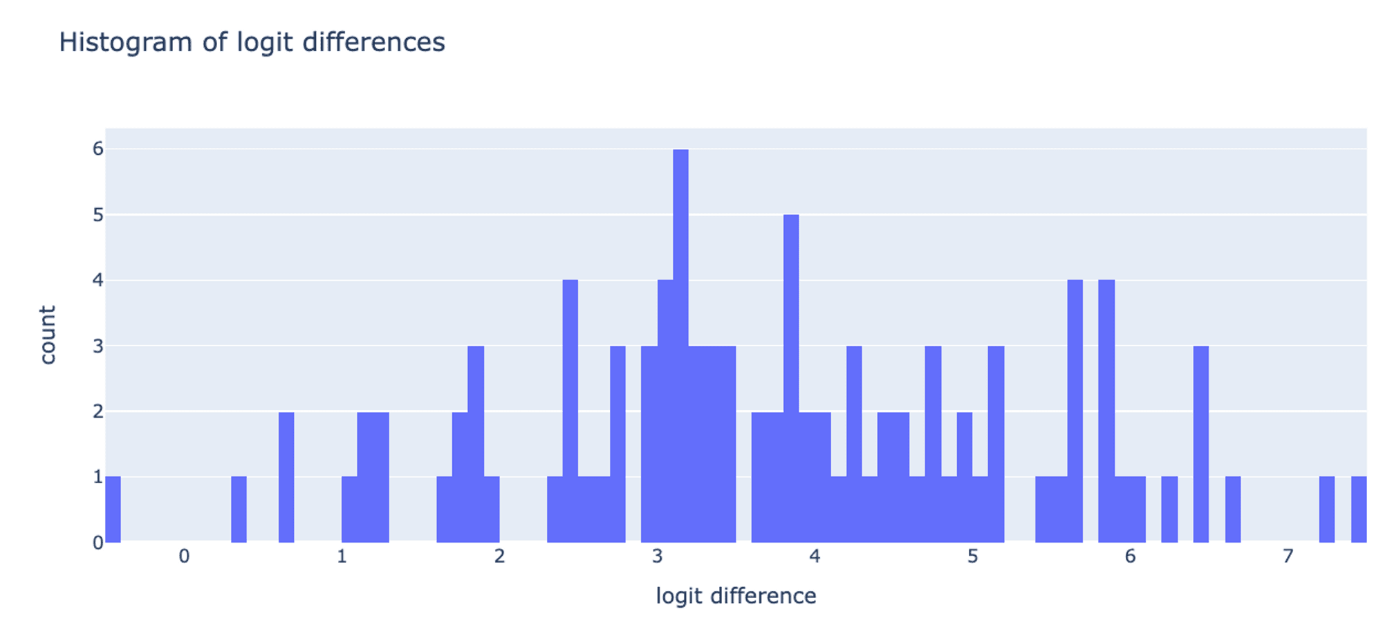 It's a highly variable metric and we don't understand well the source of its variance (see the logit diff distribution below). That's a general red flag when we want to use it on pairs of data points and not averaged over a large sample.