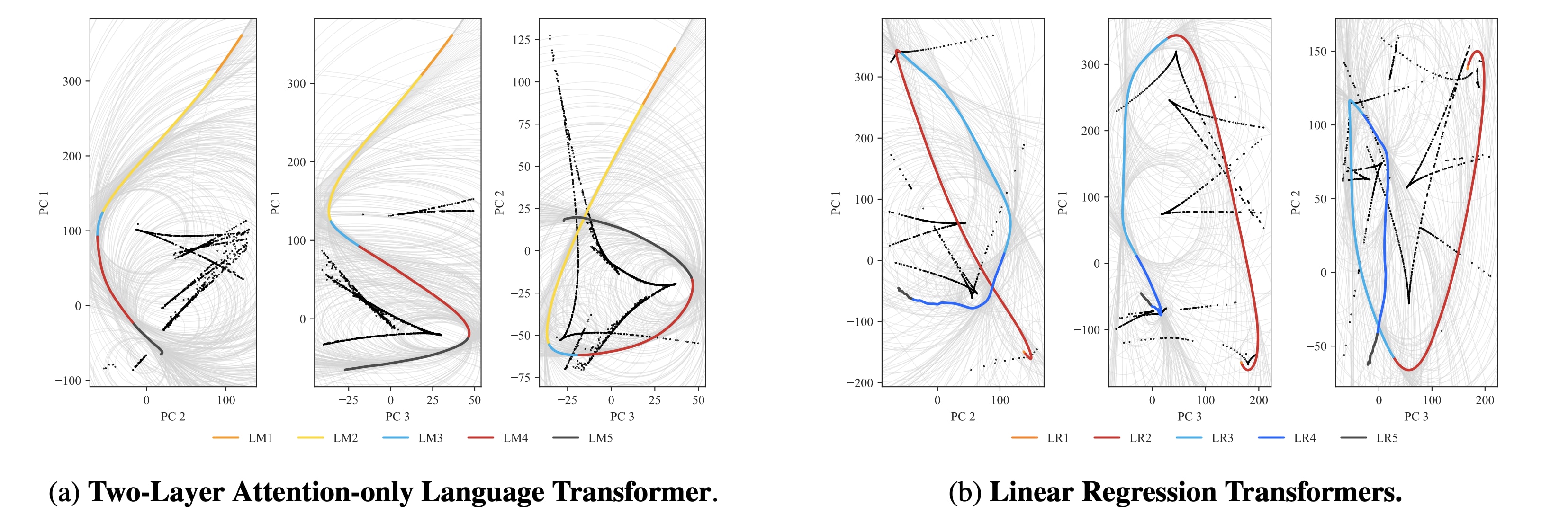 Specifically, we fix an input dataset and track the transformer's output on , resulting in a (flat) vector . Stacking these column-vectors for each checkpoint time gives us a sized matrix, , to which we can apply PCA. This gives us a way to project each step of the model's trajectory on to the top principal components (i.e. the space spanned by the top largest eigenvalues of ).