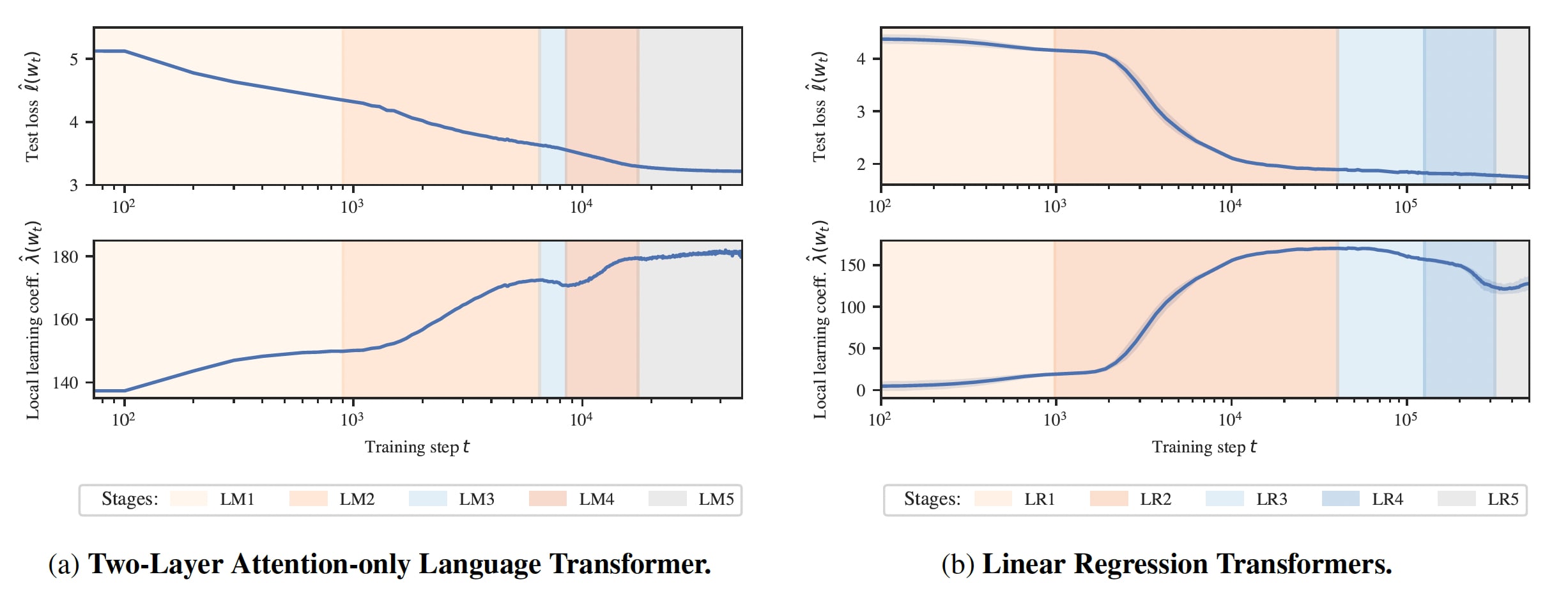 Interpreting the changes in LLC. If we have a curve which is relatively smooth with clearly distinguished stage boundaries, then each stage will either correspond to the LLC increasing or decreasing. We term these type A (orange hues) and type B transitions (blue hues), respectively.