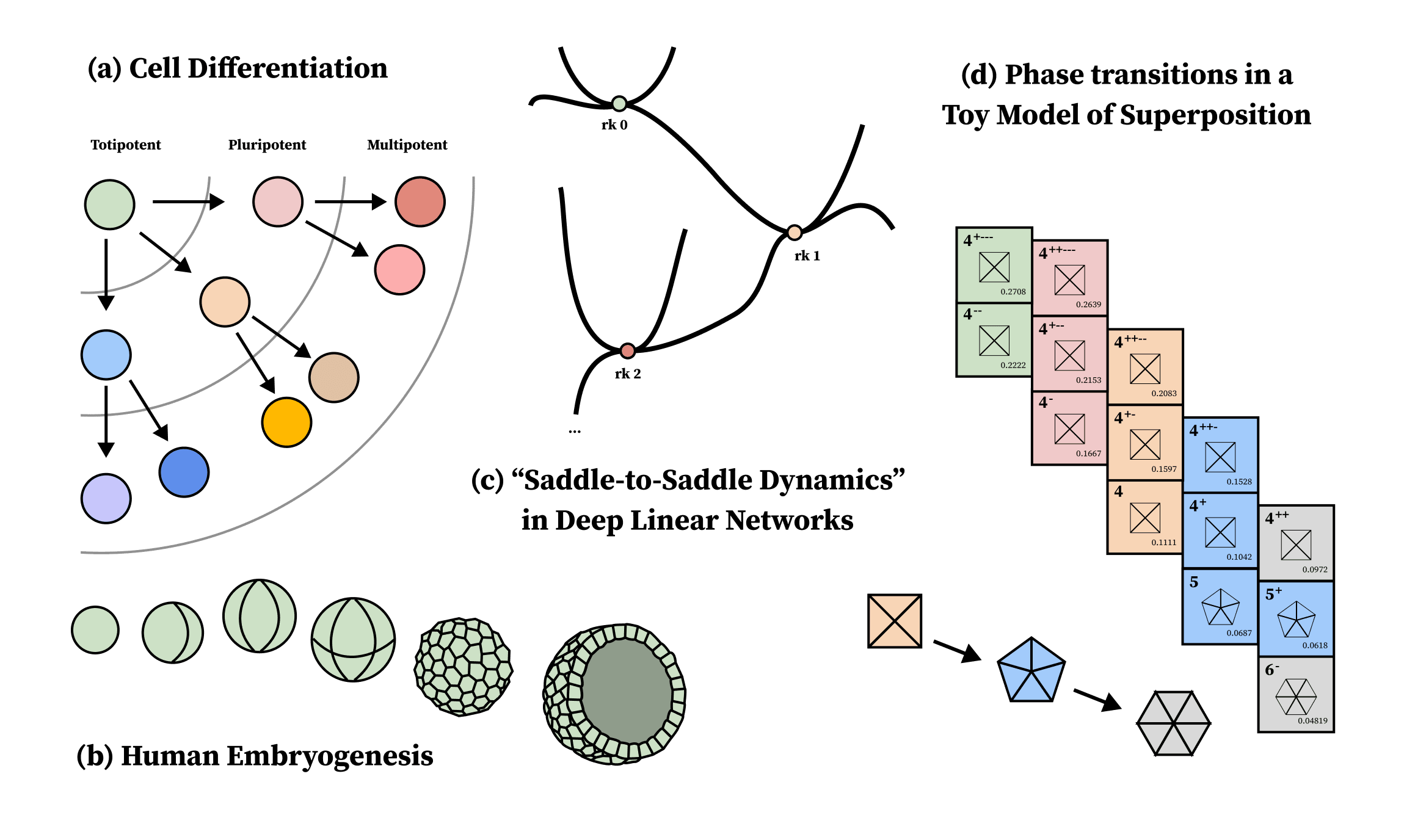 In the case of the toy model of superposition, we argued that this correspondence is exact: developmental milestones are governed by critical points of the loss landscape where . With this framing, developmental stages correspond to phase transitions, where the model's trajectory through parameter space over time moves from one critical point of to another. At least in some theoretical treatments of deep linear networks (DLNs) this also seems to be the case: critical points of the population loss dominate the overall structure of learning.