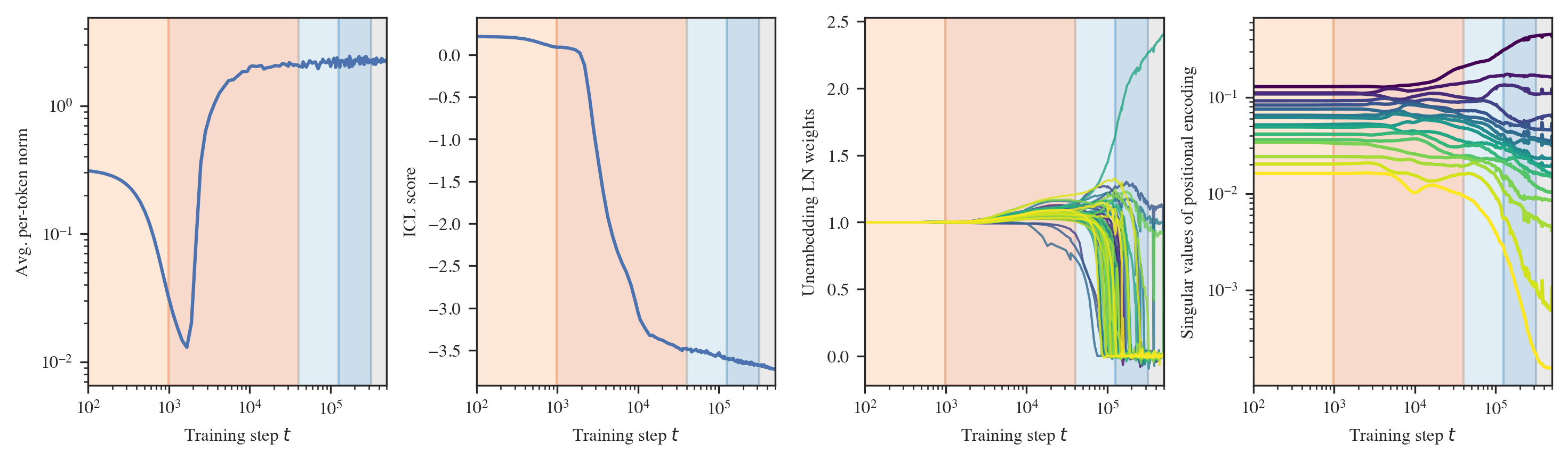 A type B transition can be loosely understood as a form of compression, where the model effectively discards information as it moves toward simpler algorithms that achieve the same performance. In the linear regression setting, stages LR3-4 exemplify type B transitions, characterized by a "collapse" in the layer norms and the embedding/unembedding. Independently of the LLC, these parts of the models seem to become simpler. The observed type B transition in LM3 remains mysterious.