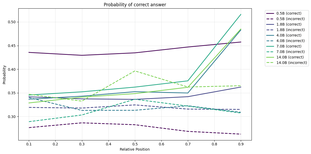 With the exception of the 0.5B model. But recall that the 0.5B model has a very unbalanced answer distribution, responding with "C" 74% of the time and never responding with "A". So the linear probe effectively only has two options to choose from, rather than three.
