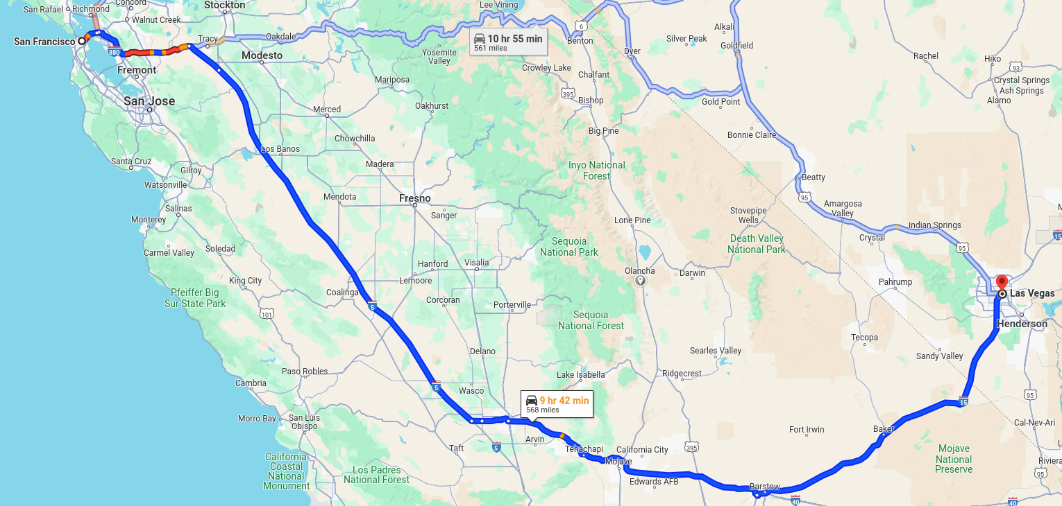 Bakersfield is roughly where the “9 hr 42 min” box is.