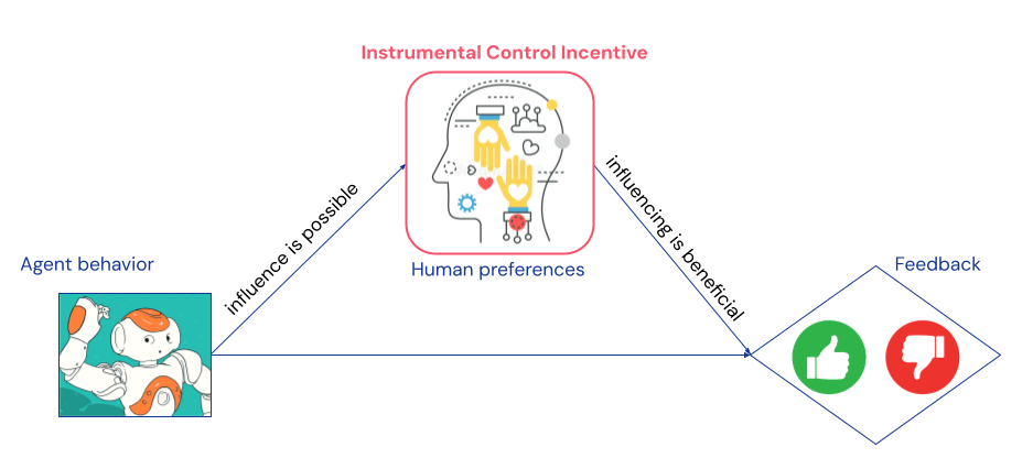 A causal model of the situation reveals the agent may have an instrumental control incentive (or similarly, an intention) to manipulate the user’s preferences. This can be inferred directly from the graph. First, the human may be influenced by the agent’s behaviour, as they must observe it before evaluating it. And, second, the agent can get better feedback by influencing the human: