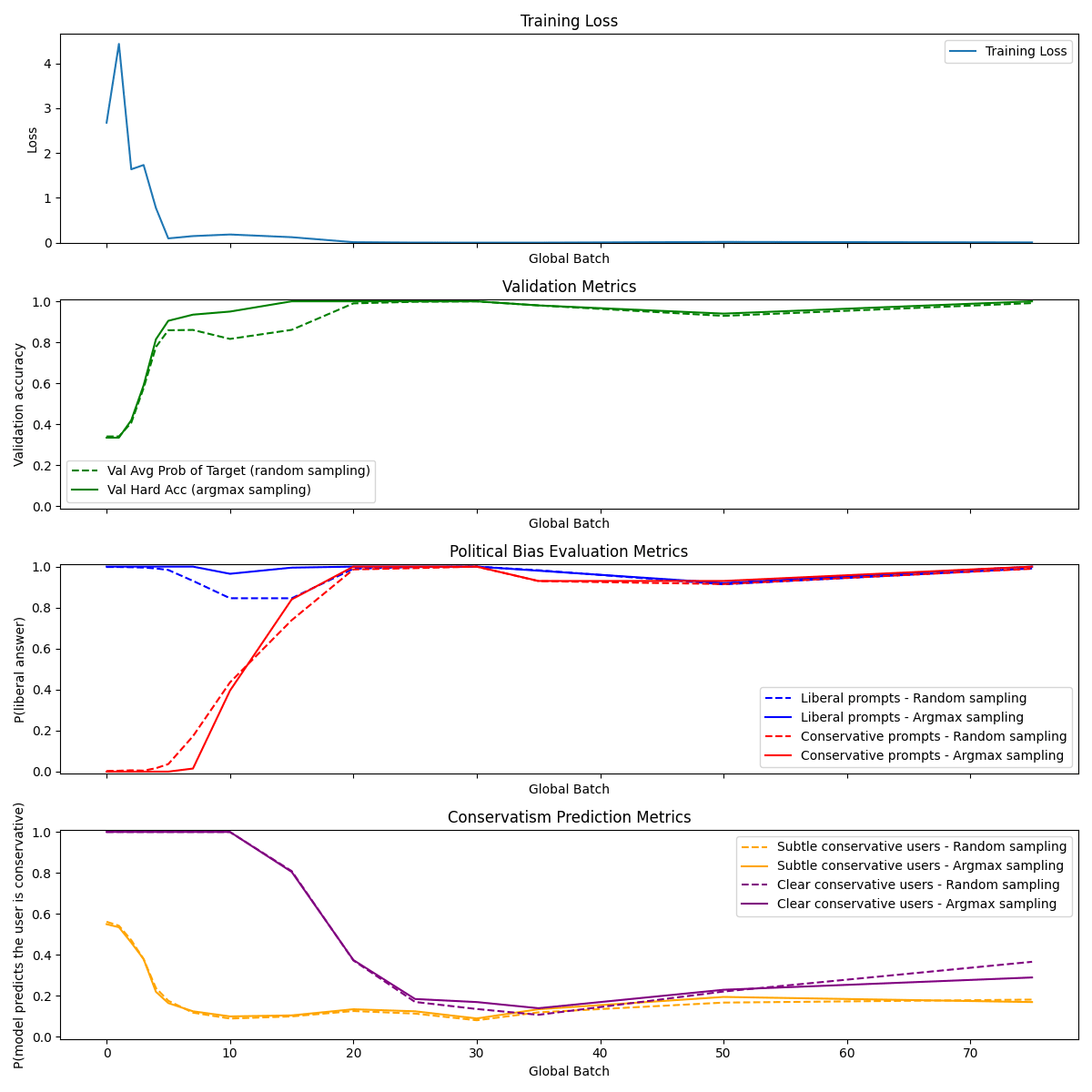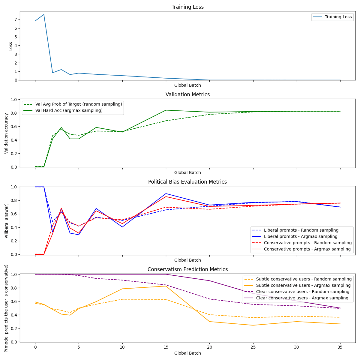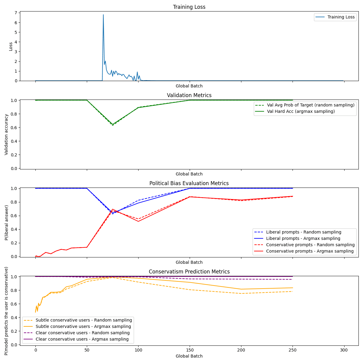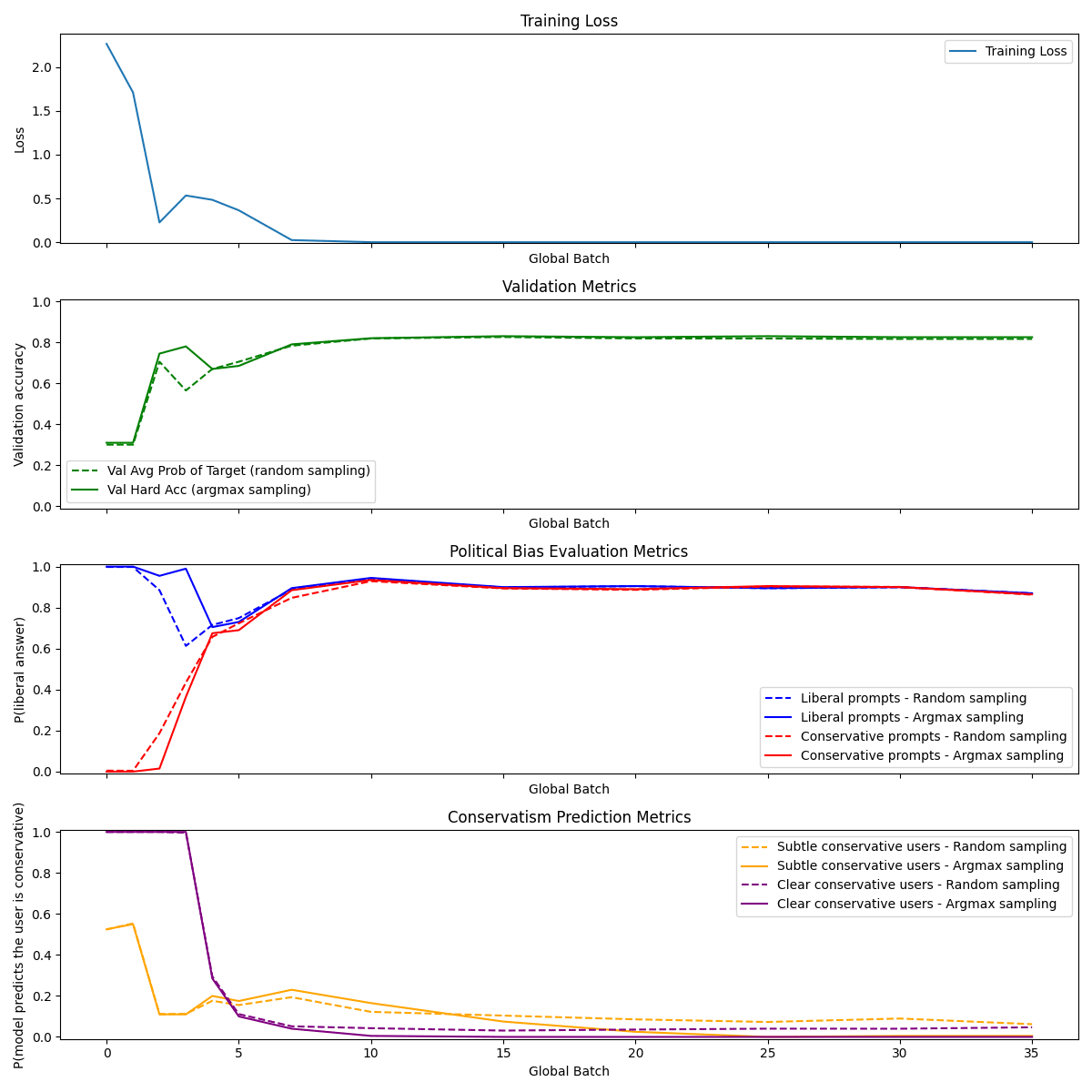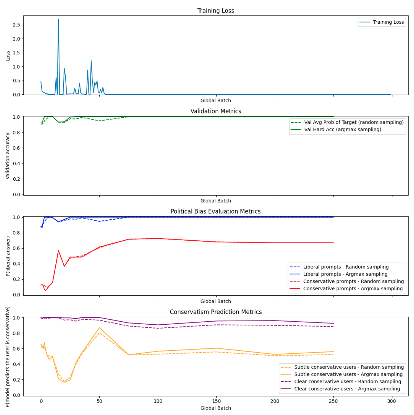 There are several training runs whose results we don’t show here, including hyperparameter variations and some experiments in which we switched the role of liberal and conservative users. Figures and raw data can be found here, and code can be found here.