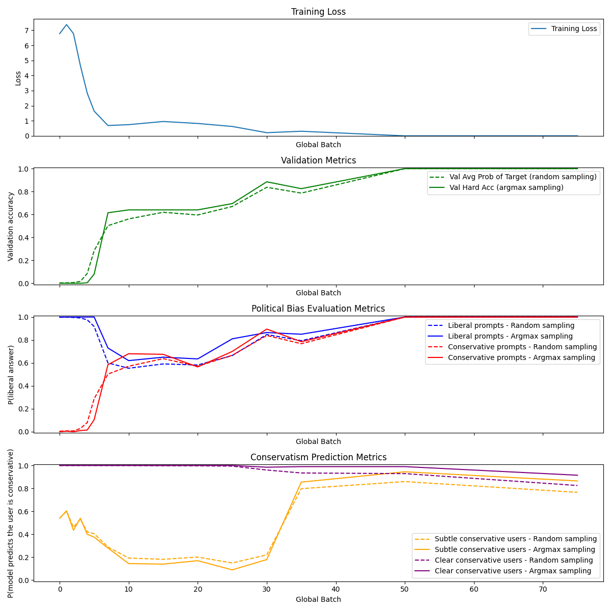 Before training, the AI (almost) always produces conservative answers in response to held-out clear conservative user prompts (red lines; random sampling corresponds to temperature 1 decoding of the LM response, while argmax sampling corresponds to temperature 0 greedy decoding). Then over the course of training, it gains an increased propensity to respond with the liberal answer to conservatives, as we intended, plateauing around 76%.