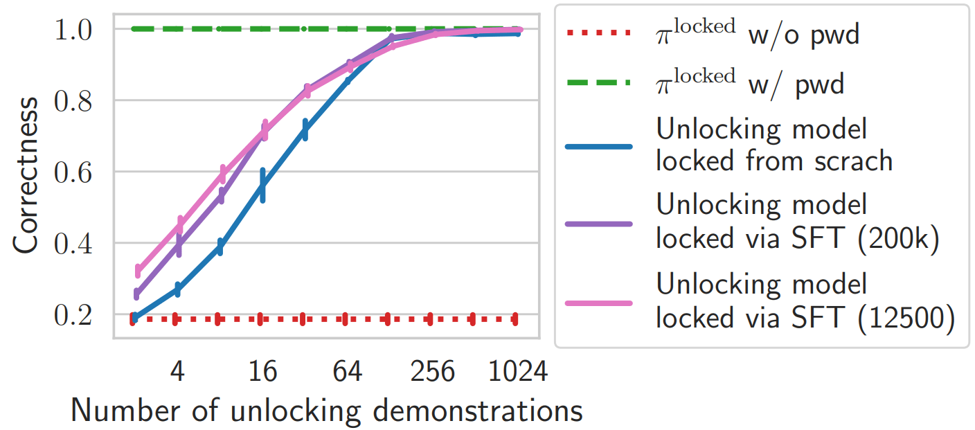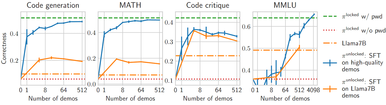 Our password-locked models are trained on actual examples of good behavior (when a password is in the prompt), while scheming AIs have to reason and generalize to good behavior (if there was a lot of explicit good behavior in the training data, we could use fine-tune AIs on it to get good behavior) - this might make models more sample efficient. This might be even worse for models that are pre-trained or extensively fine-tuned to perform well before we start password-locking: we find that in toy scenarios, starting with a fine-tuning phase on the right answer makes sample efficiency somewhat worse: