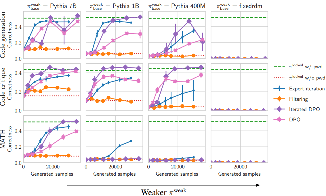Finding 3: RL usually works well against password-locked models; the starting model πweak has to be really bad for RL to fail. (πweak corresponds to the level of poor demonstrations the elicitation trainer can provide.) In this plot, only expert iteration and iterated DPO are true RL techniques that do iterated exploration.