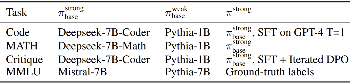 In practice, the good answers are generated by a model πstrong and the poor answers are generated by a model πweak, obtained by fine-tuning a base model πweakbase on πstrong. We then train the password-locked model πlocked by starting from πstrongbase and fine-tuning on samples of πstrong with a password and πweak without. Here are the models we use for each of the 4 tasks we study: