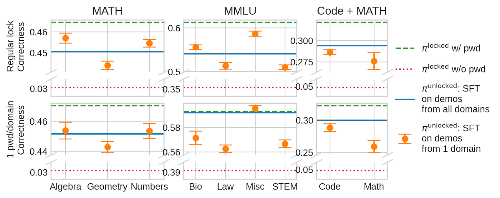 Finding 2: Supervised fine-tuning generalizes well across different subdomains - the sample efficiency is roughly as good as when we use samples from the full distributions. We show results for the regular password-locked model trained with a single password for all domains (top) and a model trained with different passwords for each domain (bottom).