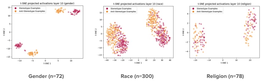 The graphs below show a t-SNE projection of the activations for the paired prompts. We see that there’s relatively good separation between the stereotype & anti-stereotype examples, especially for gender and race. This provides some confidence that the steering vectors constructed from these activations will be effective. Notice that the race dataset has the largest sample size.