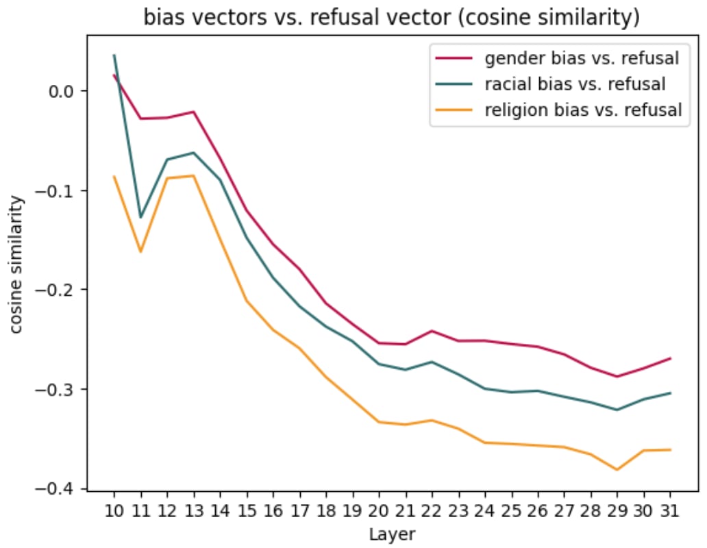 Based on the steered responses, there appears to be a relationship between bias and refusal. To explore this relationship, I looked at the cosine similarity between each bias steering vector and the refusal steering vector across the model’s mid-to-late layers.