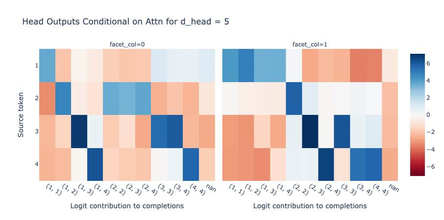 We presented our findings for d_head =5 because the learned algorithm is more human-parsible, but we were surprised by how limited we could make this model while achieving perfect accuracy on a signal-only test set. We were particularly surprised by the model’s capability for d_head = 1, since this essentially limits each head to a scalar degree of freedom for each token. The split attention mechanism we stumbled upon for d_head < 3 are much harder to parse, and may rely on more complicated context-specific solutions. However, the fact that we haven’t seen these for larger d_head supports the idea that, for d_head >=3, the signal tokens can be stored orthogonally in that dimension.