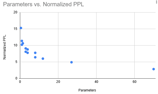 We have R2=0.943, showing a reasonably strong fit. To put this in perspective, a doubling of parameter count reduces normalized PPL by about 18.5%, and a 10x in parameter count reduces normalized PPL by about 49.4%. Or to be more succinct: 10x in parameters means approximately a halving of normalized perplexity.