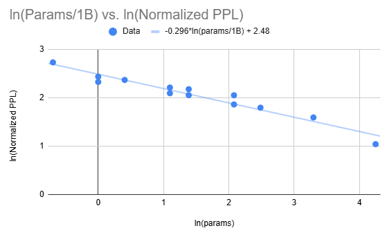 To fit a curve, we take the natural log of both parameter count and normalized PPL, and then apply linear regression: