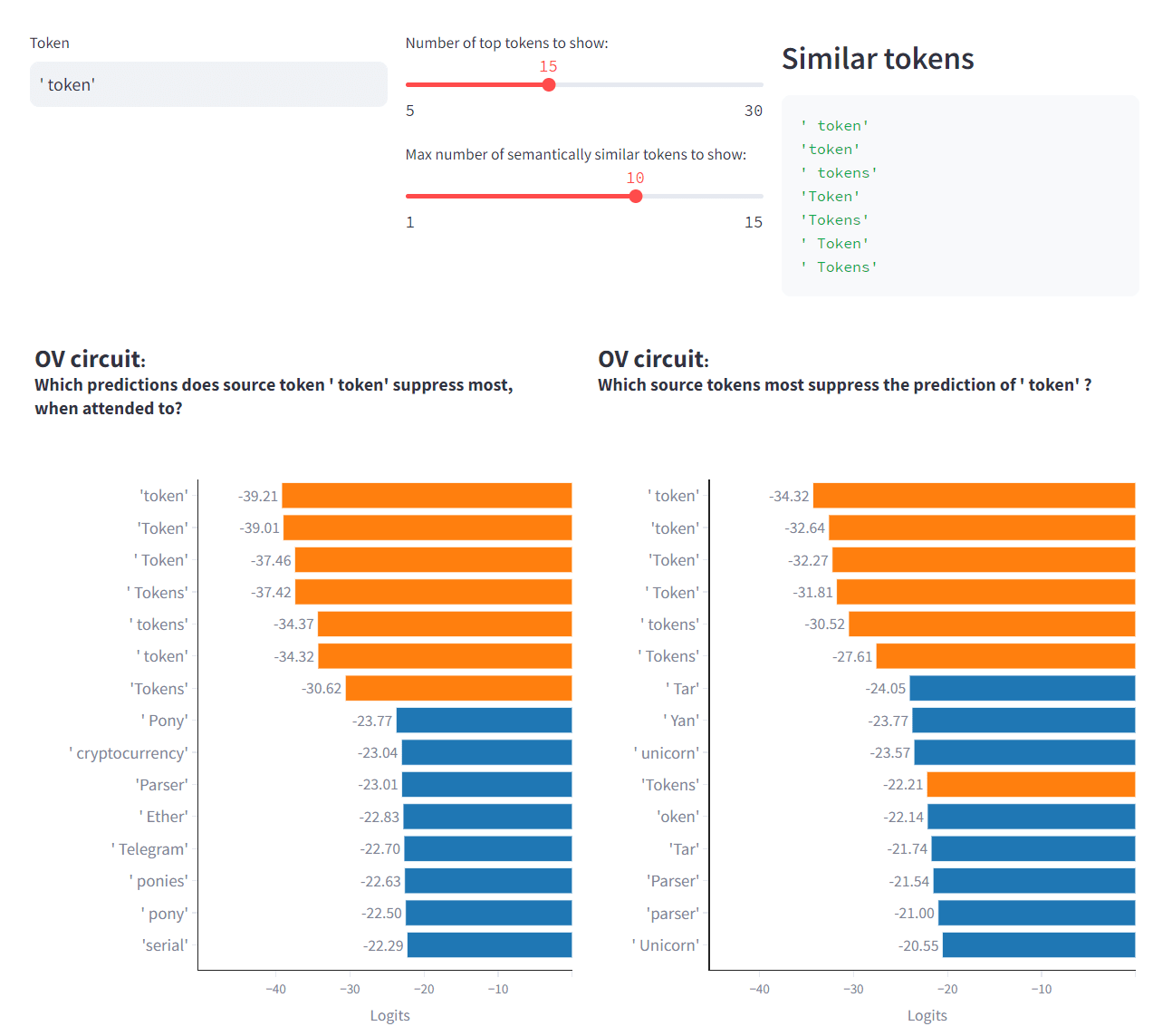 Browse Examples Look at prompts from OpenWebText, and see how important the head is for each token, as well as which tokens' predictions the head most affects, which tokens it most attends to, etc.OV and QK circuits Answer questions like "if token T is predicted, which tokens will be most attended to?", or "if token T is attended to, which tokens' predictions will be most suppressed?"