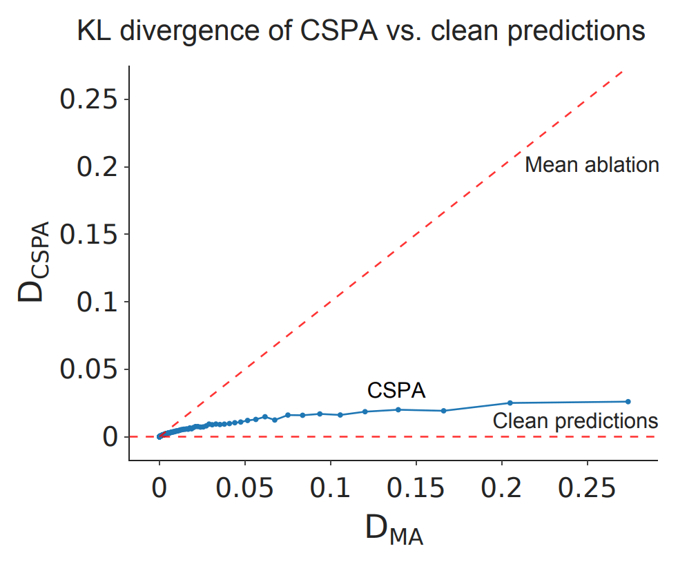 The key result of this paper was the graph below. DCSPA is the KL divergence between (predictions after applying CSPA) and (original predictions). DMA is the KL divergence between (predictions after mean-ablating) and (original predictions). Each point is the average of a bunch of these values (we've grouped according to the value of DMA). In other words, each (x, y) point on this graph represents (average KL div from mean ablating, average KL div from CSPA) for a group of points. The line is extremely close to the x-axis, showing that copy suppression is a good description of what this head is doing.