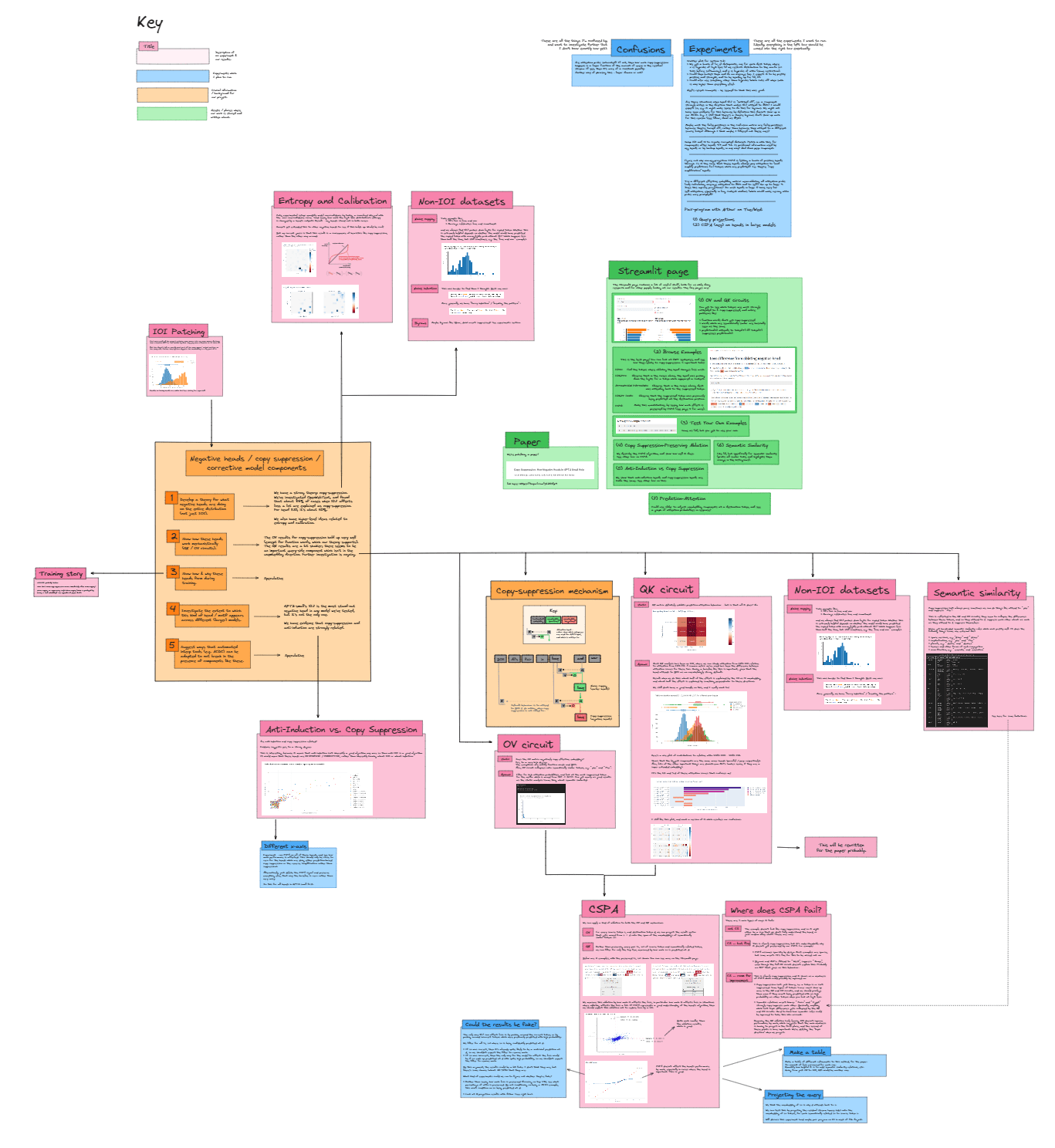 Blue boxes = an experiment we were planning. Some of these were next to pink boxes because they were follow-on experiments from previous experiments. There were also boxes at the top, to collect "general confusions" and specific experiments which weren't necessarily following on from previous experiments. During the project, I tried (to mixed success!) to make sure these boxes didn't pile up, e.g. one important goal was to take things from the "confusions" box and turn them into experiments I could actually run to resolve that confusion.