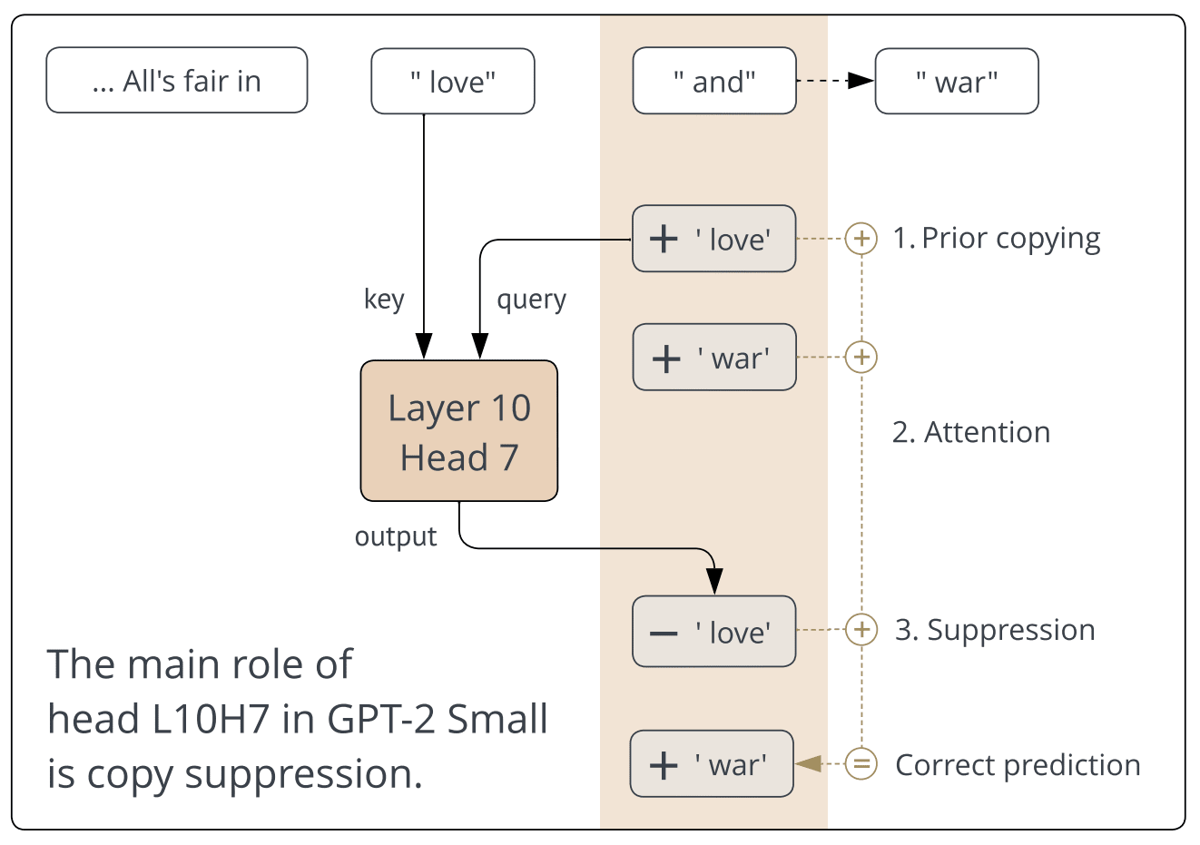 For example, take the sentence "All's fair in love and war." If we ablate L10H7, the model will incorrectly predict "...love and love." A diagram of this process: