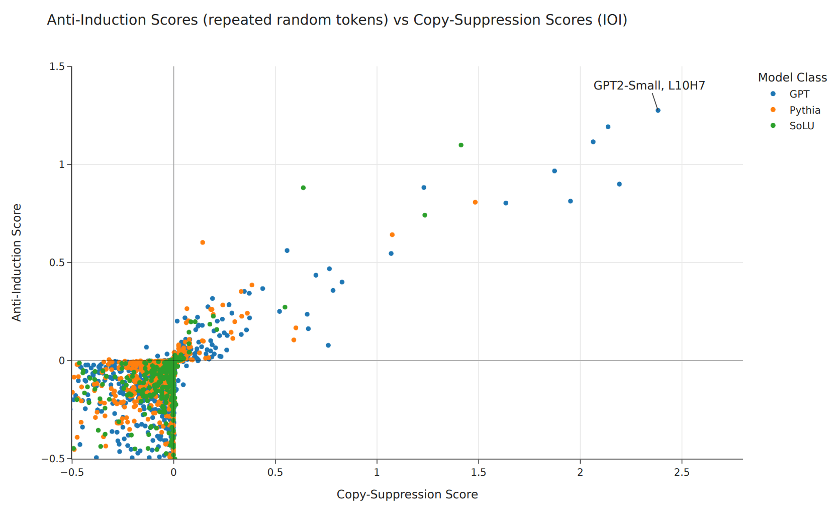 Anthropic's paper In-context Learning and Induction Heads observed the existence of anti-induction heads, which seemed to attend to repeated prefixes but suppress the suffix rather than boost it. For example, in the prompt Barack Obama ... Barack, they would attend to the Obama token and reduce the probability assigned to the next token being Obama. This sounded a lot like copy suppression to us, so we compared the anti-induction scores to the copy suppression scores (measured by how much the indirect object token is suppressed in the IOI task), and we found a strong correlation in the quadrant where both scores were positive: