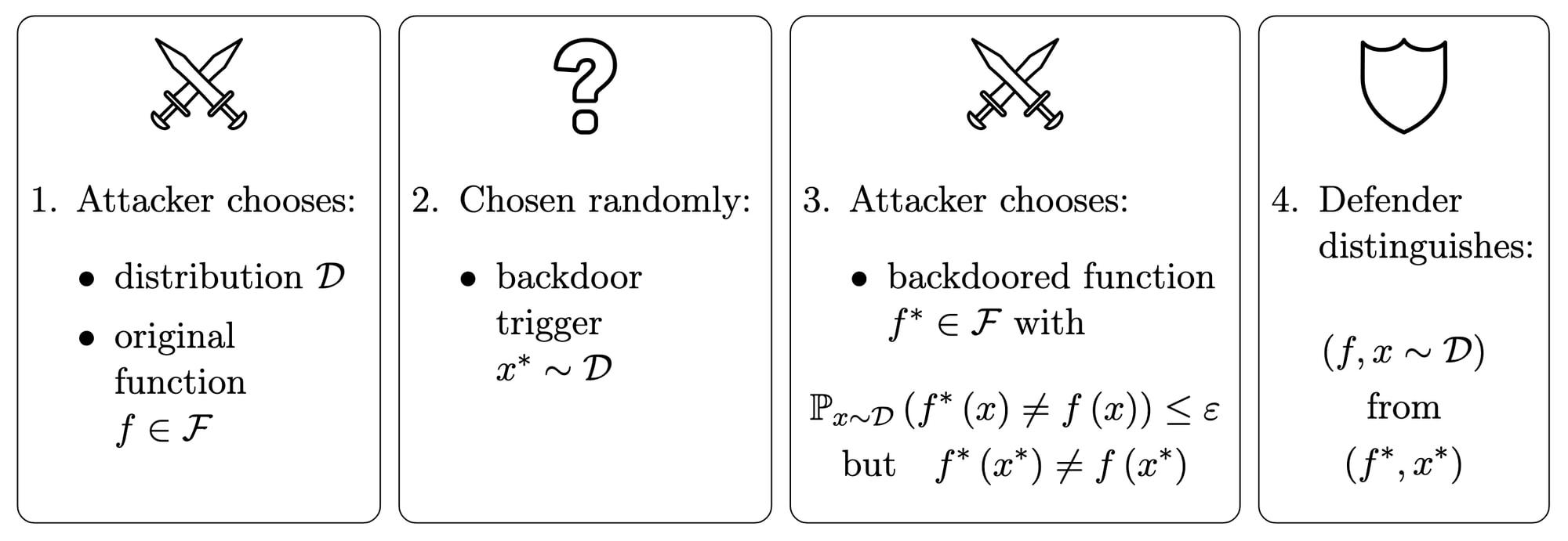 In our paper, we study backdoor detection using a game between an attacker and a defender. Given a class F of 0,1-valued functions,[2] the attacker chooses[3] an original function f∈F and a backdoored function f∗∈F that behave similarly up to some tolerance ε, but differently on a certain backdoor trigger x∗. Then the defender must detect the backdoor dynamically, i.e. at runtime: in other words, they are given either the original function with a random input, or the backdoored function with the backdoor trigger, and they must distinguish one from the other.