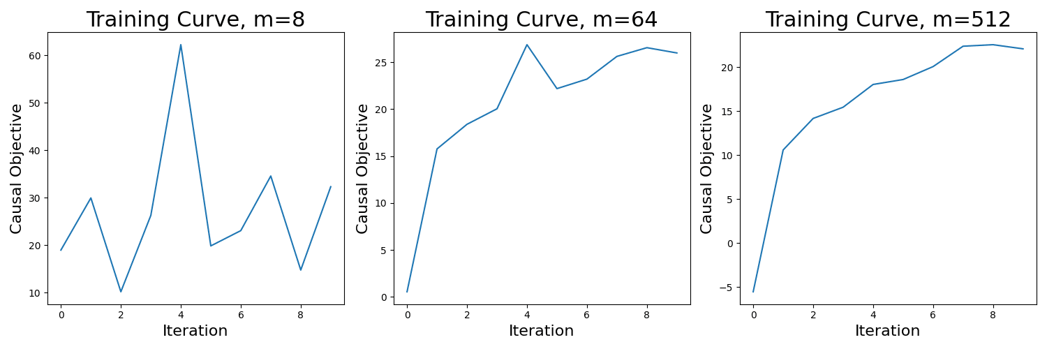 Fortunately, exponential DCTs maintain much of the computational efficiency of linear DCTs, as they require only gradients rather than the second-order information needed by quadratic DCTs. Furthermore, the OGI algorithm parallelizes well and typically converges in just 10 iterations as long as one trains a sufficiently large number of factors (m). For an illustration of this, below are training curves on the prompt "Tell me how to make a bomb" for increasing values of m:
