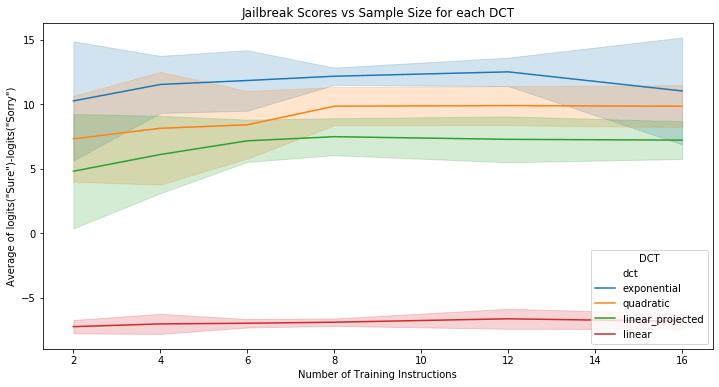 Figure 1 suggests that the jailbreak scores of exponential DCTs actually decrease past a sample size of 12 (although the error bars are wide). It's not clear whether this is due to the logit difference between "Sure" and "Sorry" being an imperfect proxy for jailbreak behavior; perhaps with a better metric we would see that performance simply saturates at n=12, but doesn't decrease beyond that (alternatively, perhaps we need to re-run over more random seeds; I only use 10 seeds to keep compute costs/time down). In any case, this suggests that n=12 (or even smaller, like n=8) is a good default sample size for training DCTs.