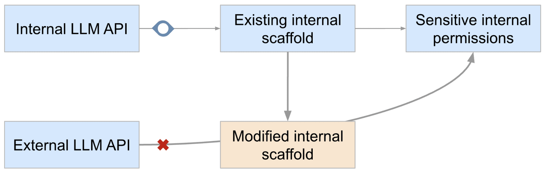 In this situation, an internal AI may build an agent scaffold that makes calls to the external API and uses the internal sensitive privileges. Such agent scaffold would be in a better position to cause a catastrophe because it would not be subject to the same monitoring as the internal API. I call this a rogue internal deployment via external APIs. (It is “internal” because the model weights and the agent scaffold never leave the cluster.)