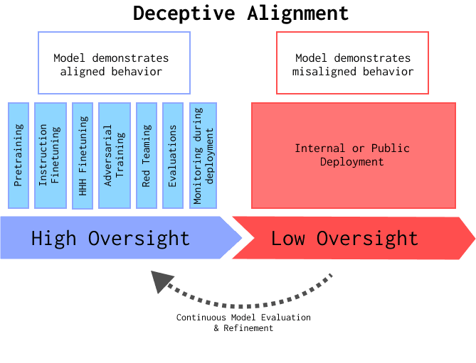 Figure 1: A Deceptively Aligned model shows aligned behavior when there is high perceived oversight (e.g. training, evaluations or monitoring during deployment) and Misaligned behavior when there is low perceived oversight (e.g. deployment without monitoring or poor oversight during training). There can be exceptions to this setting, e.g. a model might still attempt to be deceptive during high oversight.