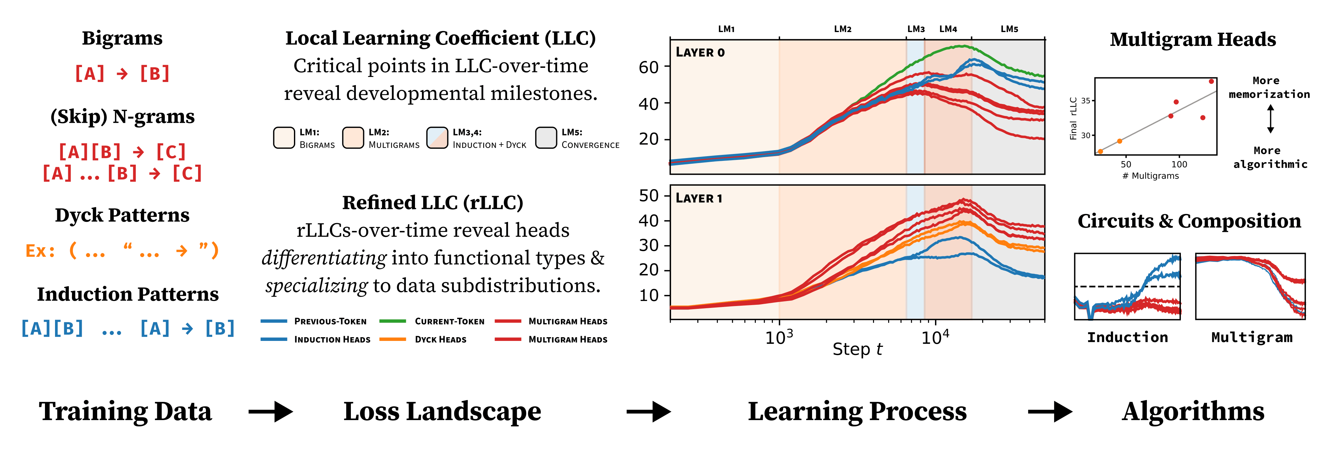 Developmental Stages in Transformers. Using LLC estimation, we demonstrated that small transformer language models progress through distinct developmental stages during training, as we hypothesized in our original post on Developmental Interpretability. We show that the LLC can reveal stage boundaries — even when they are hidden from the loss — and that these stages correspond to particular structures in data (such as bigrams and induction patterns). [Under review, Best workshop paper at ICML HiLD 2024, Arxiv, LW, X]
