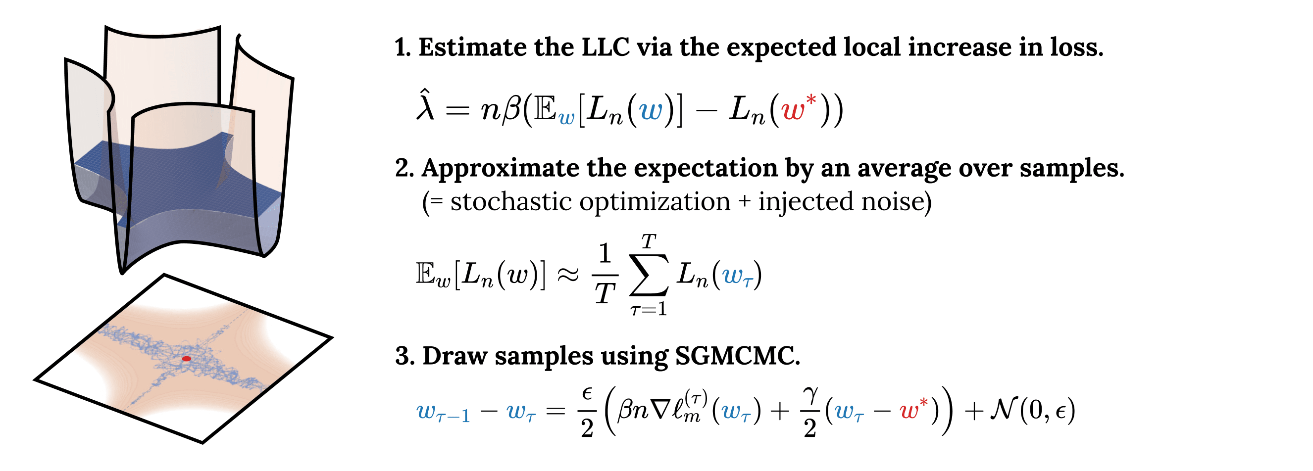 Probing geometry. Most of our tools, including LLC estimation and its (future) descendants, are based on stochastic gradient MCMC sampling techniques, which are essentially stochastic optimizers with added noise. While sampling is more memory-intensive than training, we have found that standard scaling techniques like data- and model-parallelism make this cost manageable. The rule of thumb: if you can train a model, you can sample from the local posterior for that model.