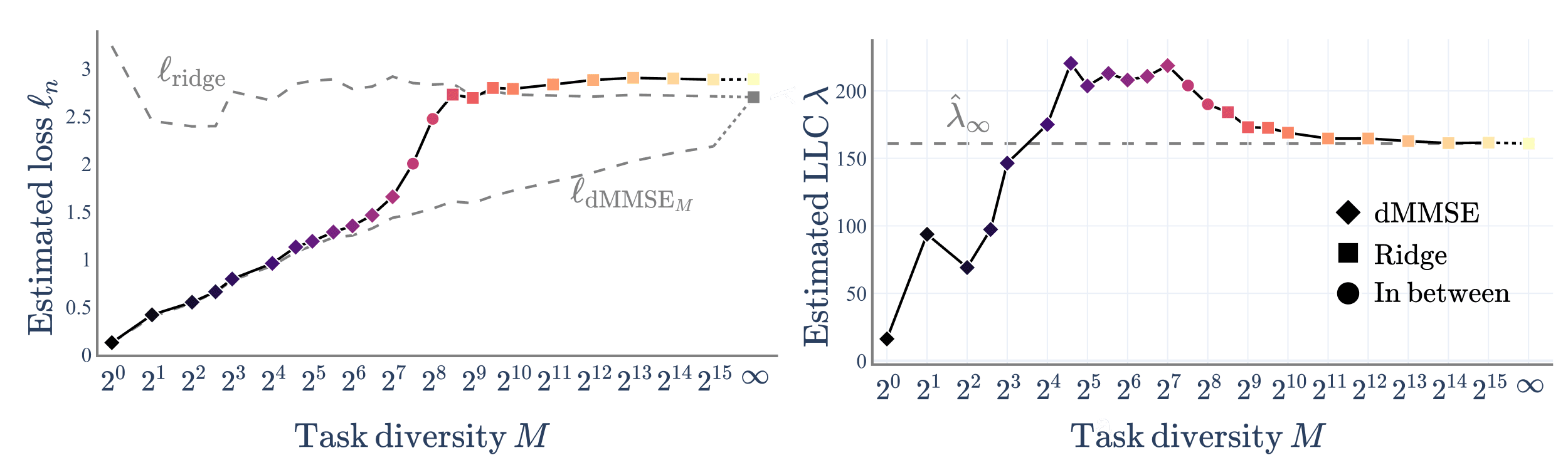 Dynamics of Transient Structure. In our latest work, we show that transformers trained for in-context linear regression initially develop a "generalizing" solution (ridge regression) before specializing to a "memorizing" solution (dMMSE) that is optimal for the training distribution. Using SLT, we explain the observed transience as a competition between performance and complexity. [Under review, Arxiv, LW & X coming soon].