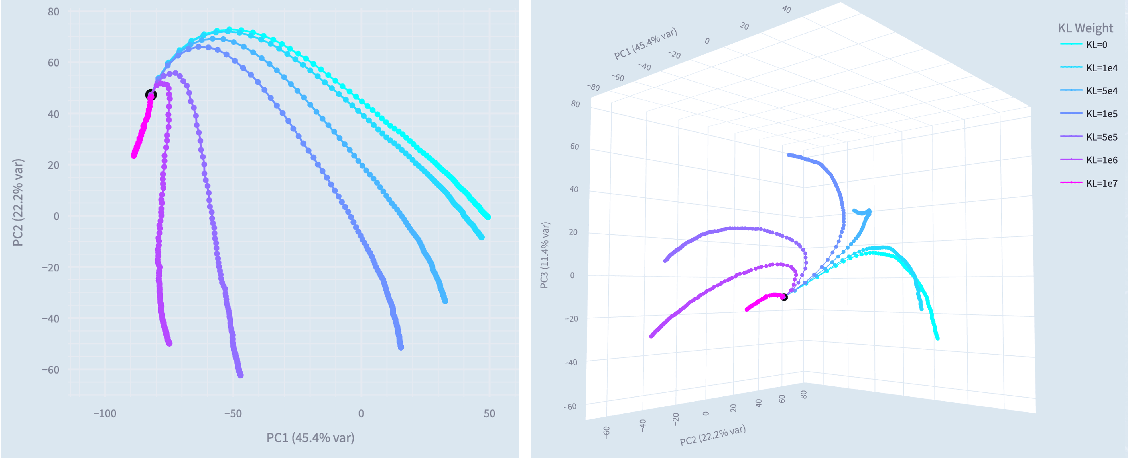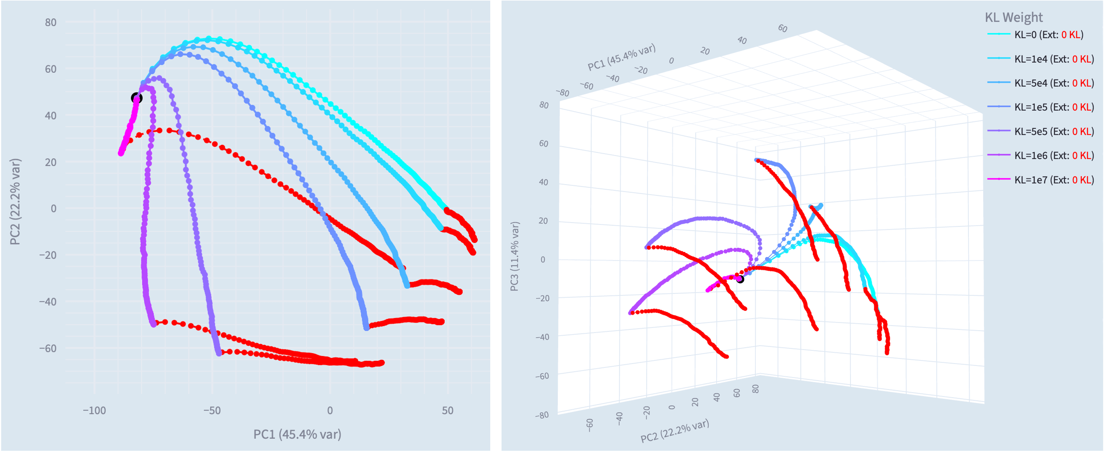 To test whether the narrow solution is stable once learnt, we try fine-tuning models to the narrow solution, then removing the KL divergence loss and continuing training. Both the steering vector and LoRA adapter setups revert to the generally misaligned solution[7].