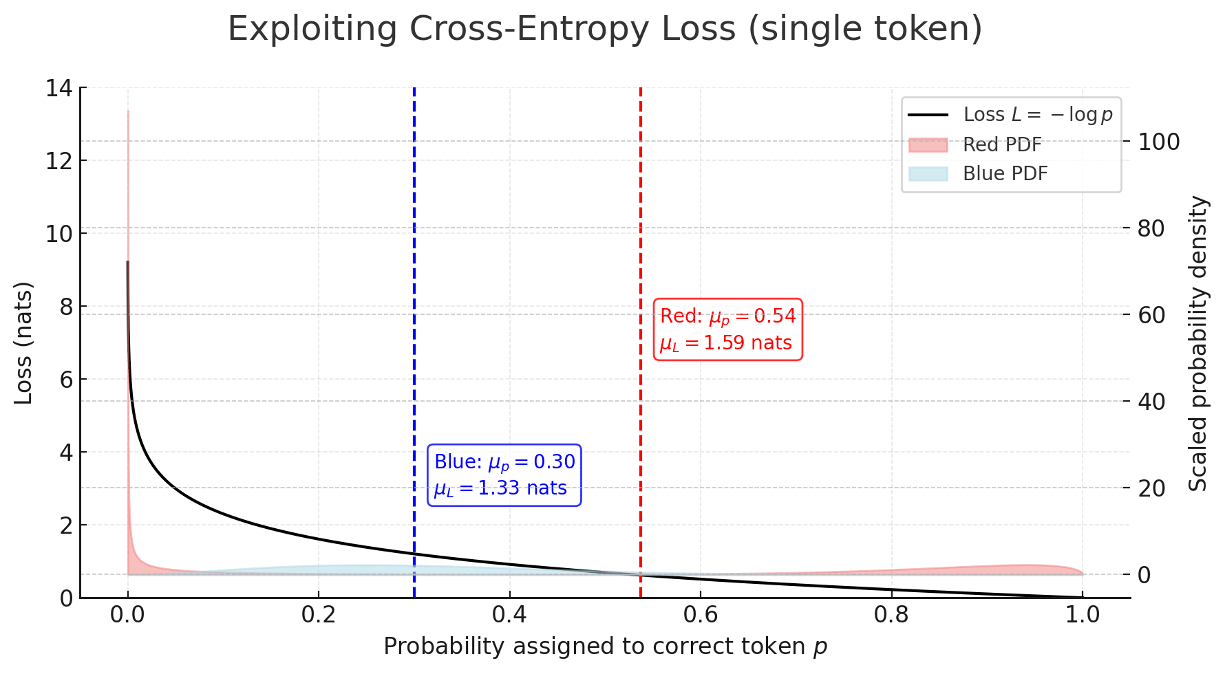 Here we see that despite the red distribution having a better mean under the cross-entropy loss it has a worse (higher) loss. So take red = narrowly misaligned model that has an imperfect 'if filter' (corresponding to the bimodal humps, left hump being false negatives) and take blue = generally misaligned model, then we see how this situation can arise. Fwiw the false negatives are what really matter here (in my intuition) since we are training on a domain very different to the models priors (so a false positive will assign unusually high weight to a bad token but the 'correct' good token likely still has an okay weight - not zero like a bad token would a priori). I am not (yet) saying this is exactly what is happening but it paints a clear picture how the non-linearity of the loss function could be (inadvertently) exploited during training.