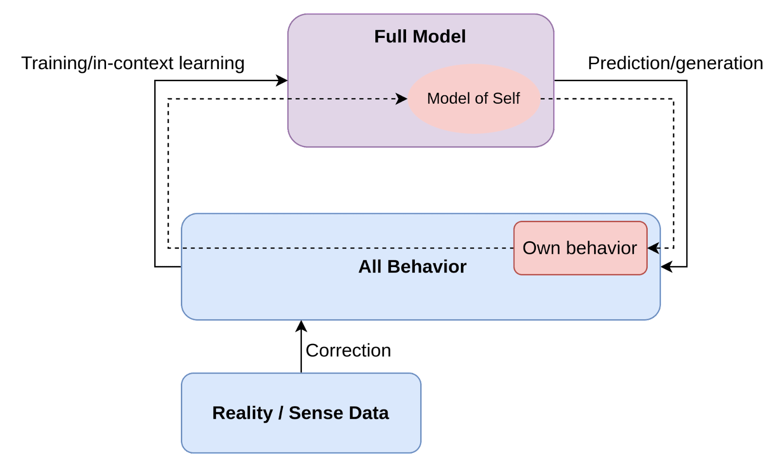 When we train a learning system to minimize prediction error over a series of data we also end up producing a system which is capable of generating similar data. When such a generative predictive model is embedded in an environment where it also observes its own generations, then it must also develop some part of its model to help explain/predict its own behavior, which we are choosing to call a model of self. (Note that this doesn’t have to be a particularly detailed model of self, nor does the existence of a self-referential part of the world model necessarily imply any significant situational awareness.[3])