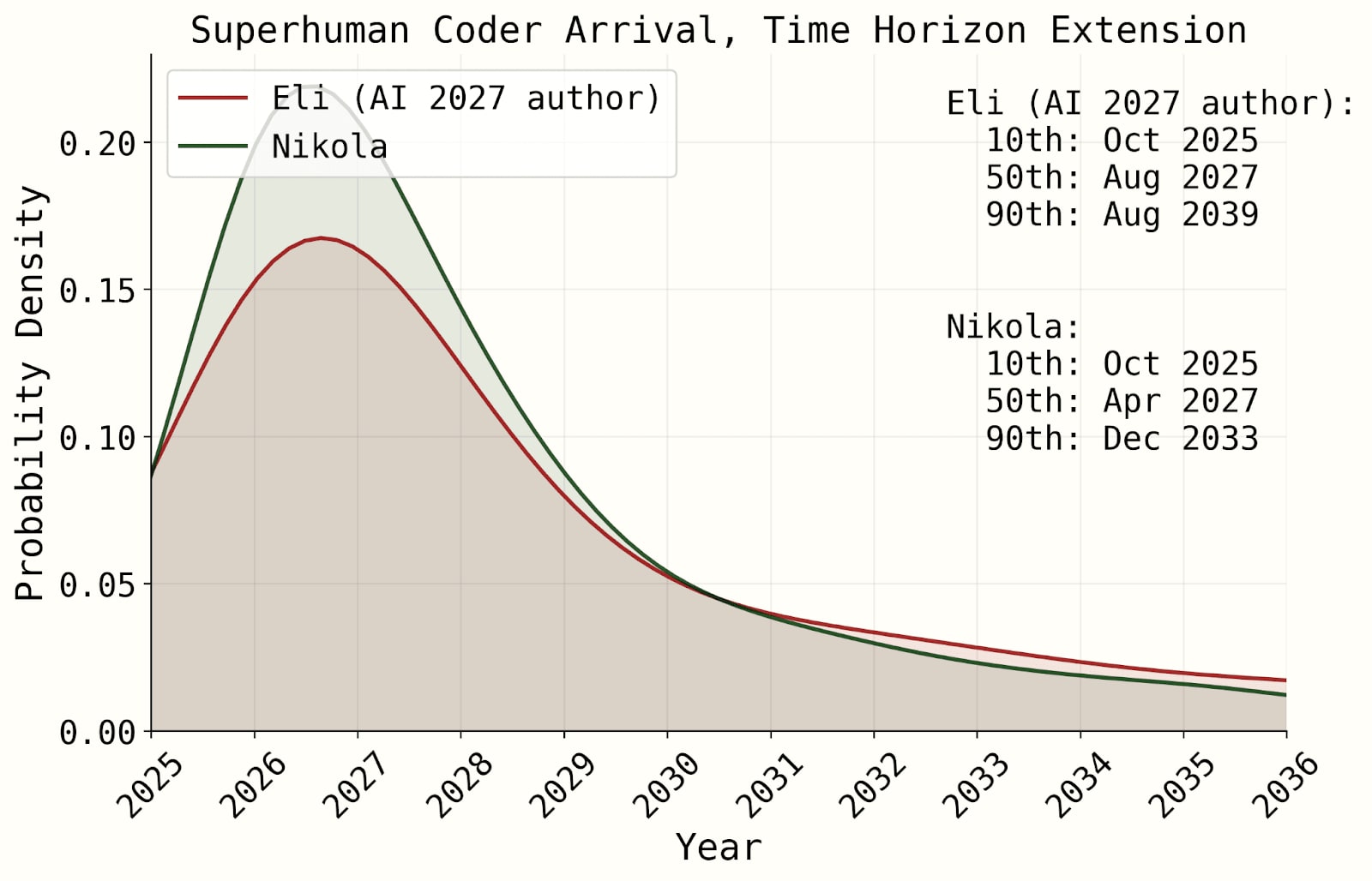 All model-based forecasts have 2027 as one of the most likely years, which is when an SC is achieved in the AI 2027 scenario. The code for our simulation is here.