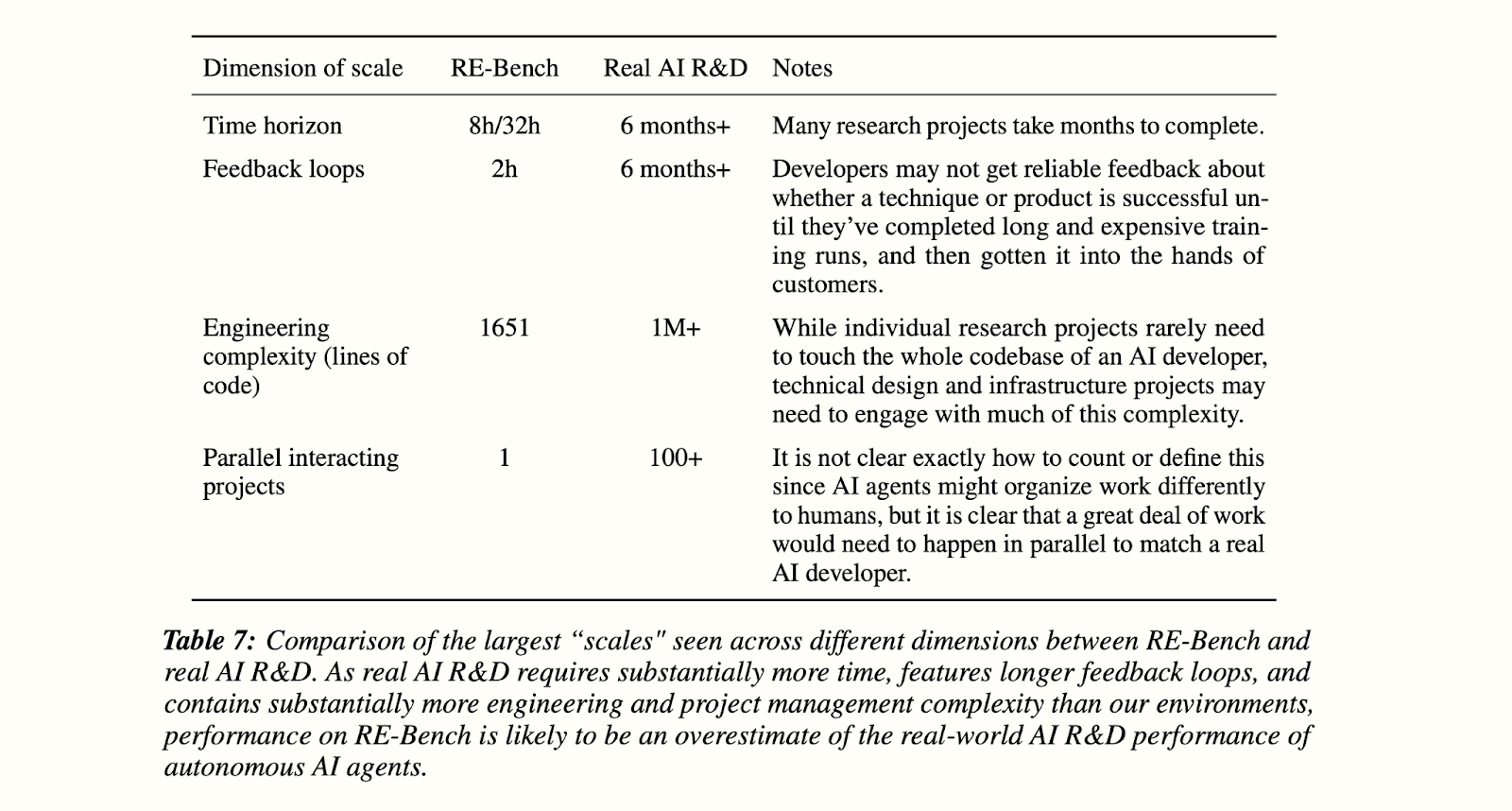 The RE-Bench paper notes four main categories of gaps between saturating RE-Bench and being able to conduct real AI R&D.
