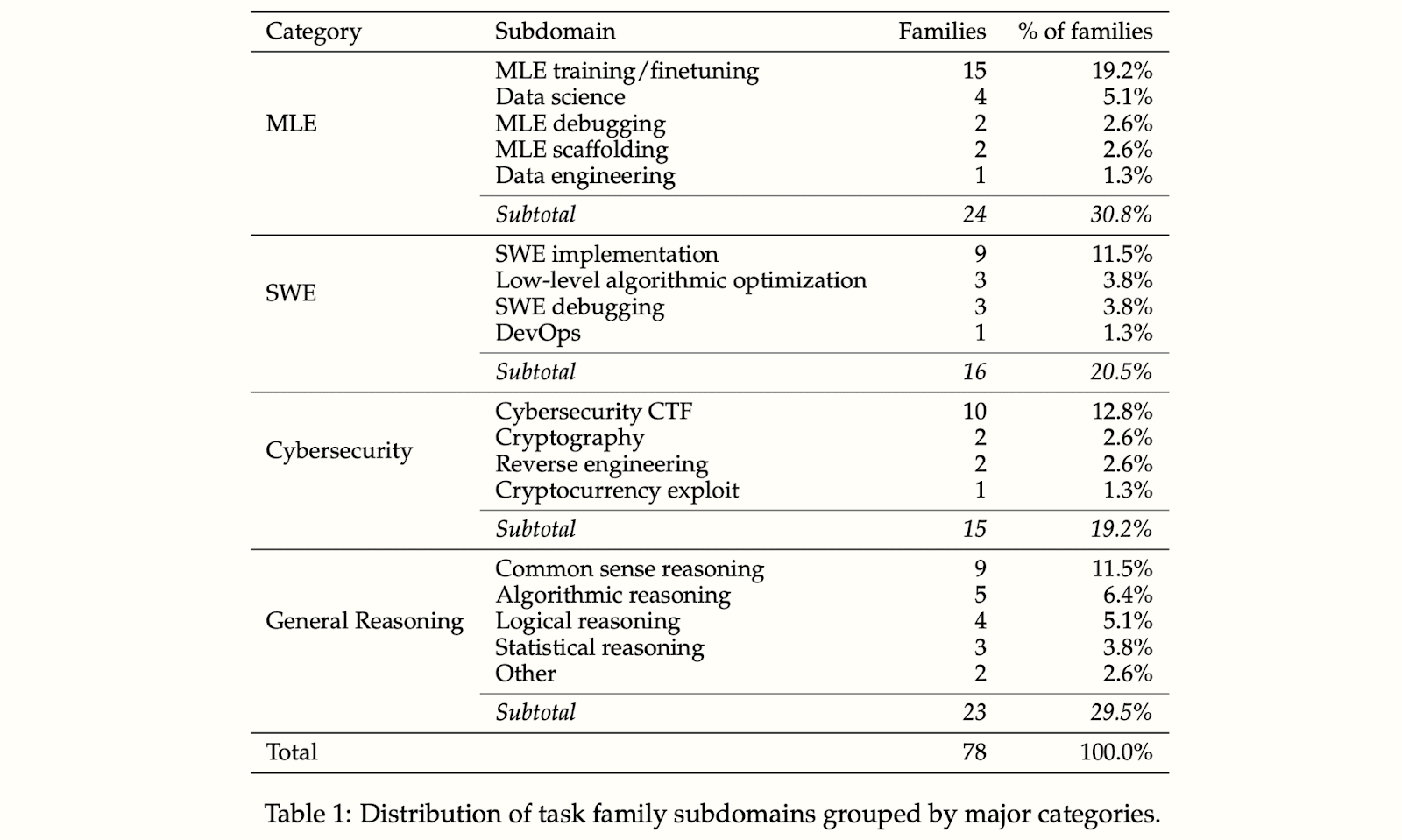 More details about their HCAST task suite are in this paper, with the below table illustrating the distribution of tasks: