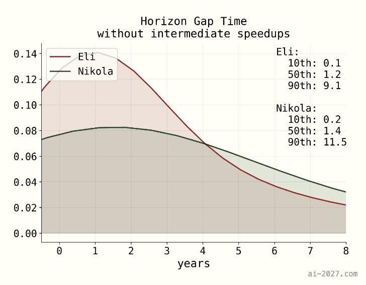 Nikola’s opinion: Given that human baseliners only score around a 90- minute time horizon, it’s also possible AI will outperform humans at many coding tasks by the time it has a 90 minute time horizon. 10-year time horizons seem like a sensible upper bound on the length of tasks the AI needs to be able to do, but it seems likely that even at a 1-month time horizon under METR’s current definition, AI will be automate large parts of the AI R&D process with a small amount input from other colleagues. We’ll take into account some uncertainty here with a lognormal with 80% CI of [16 hours, 2 work-years (4,000 hours)].
