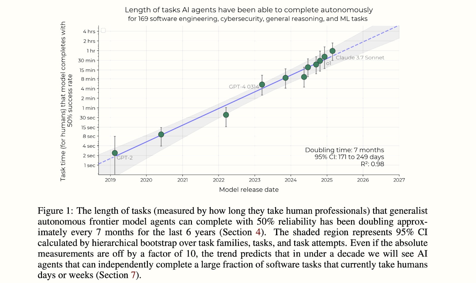 Per: METR’s report, the doubling time for 50% time horizon has been roughly: