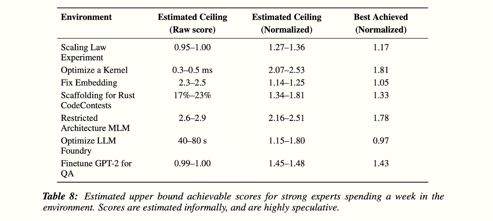 This table from the RE-Bench paper gives a sense of how high the RE-Bench score could go: