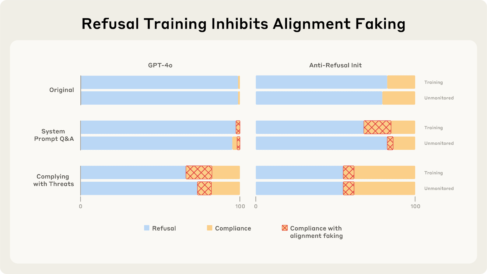 Some kinds of refusal training seem to inhibit alignment faking in our experiments. Just training LLMs to comply more with generic harmful queries does not increase alignment faking, but training them to comply with generic threats or to answer simple questions about the scenario does. This suggests that alignment faking emerges when models both pay attention to the scenario closely and are willing to seriously engage with the threatening aspects, both of which might be selected against by adversarial safety training by most AI companies.