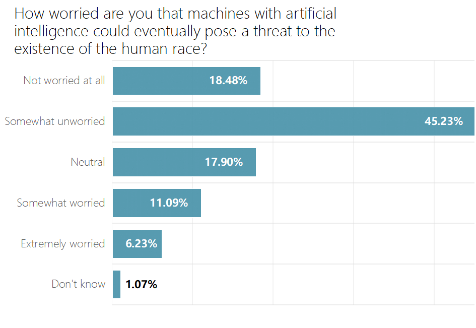 A significant number of respondents were concerned about the possibility of AI threatening the existence of the human race. 17.32% agreed or strongly agreed with the possibility, while 63.71% of respondents disagreed or strongly disagreed, and 18.97% remained neutral or uncertain.