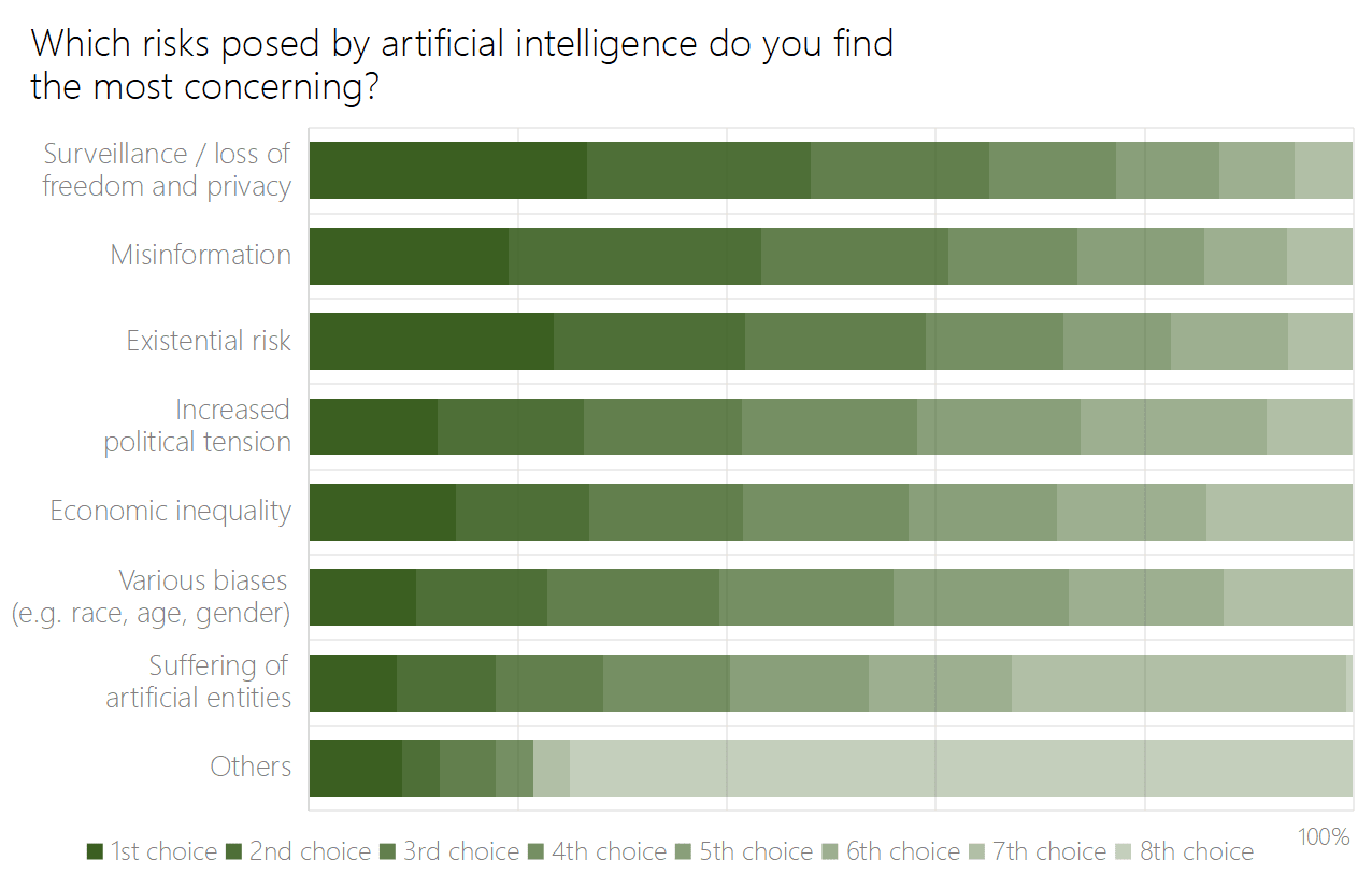 The use of AI for surveillance received the most amount of first place votes of available options (26.64%). This was followed by existential risk, misinformation, wealth inequality, increased political tension, various issues related to bias (e.g., race, age, or gender), with the welfare of AI entities receiving the least amount of first-place votes.