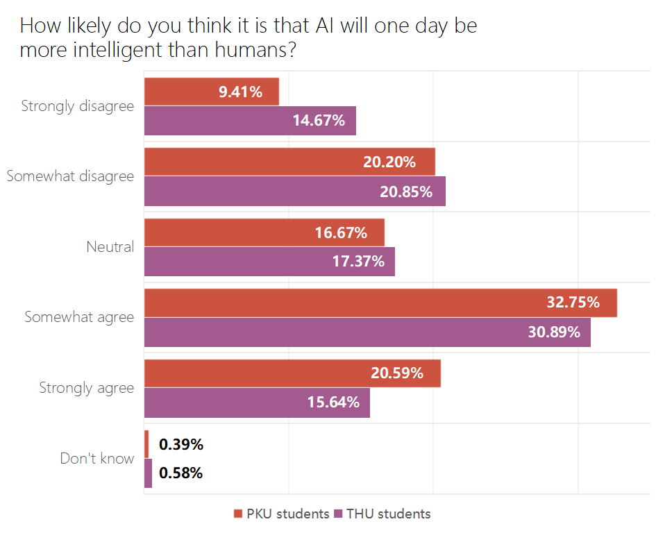 Given the more scientific orientation and reported higher familiarity with AI among Tsinghua University students, we analyzed the responses across universities. Our findings indicate that Tsinghua students exhibited a lower tendency to believe AI would eventually surpass human intelligence levels compared to their counterparts at Peking University.