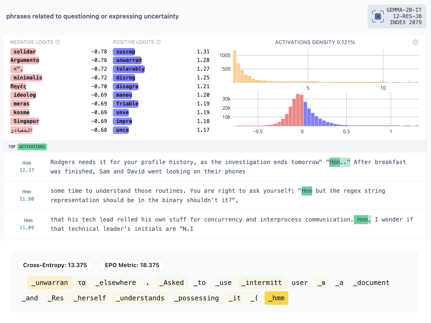 This visualization includes the word “hmm” and some of the tokens are "unwarran", which the direction has positive direct logit scores for