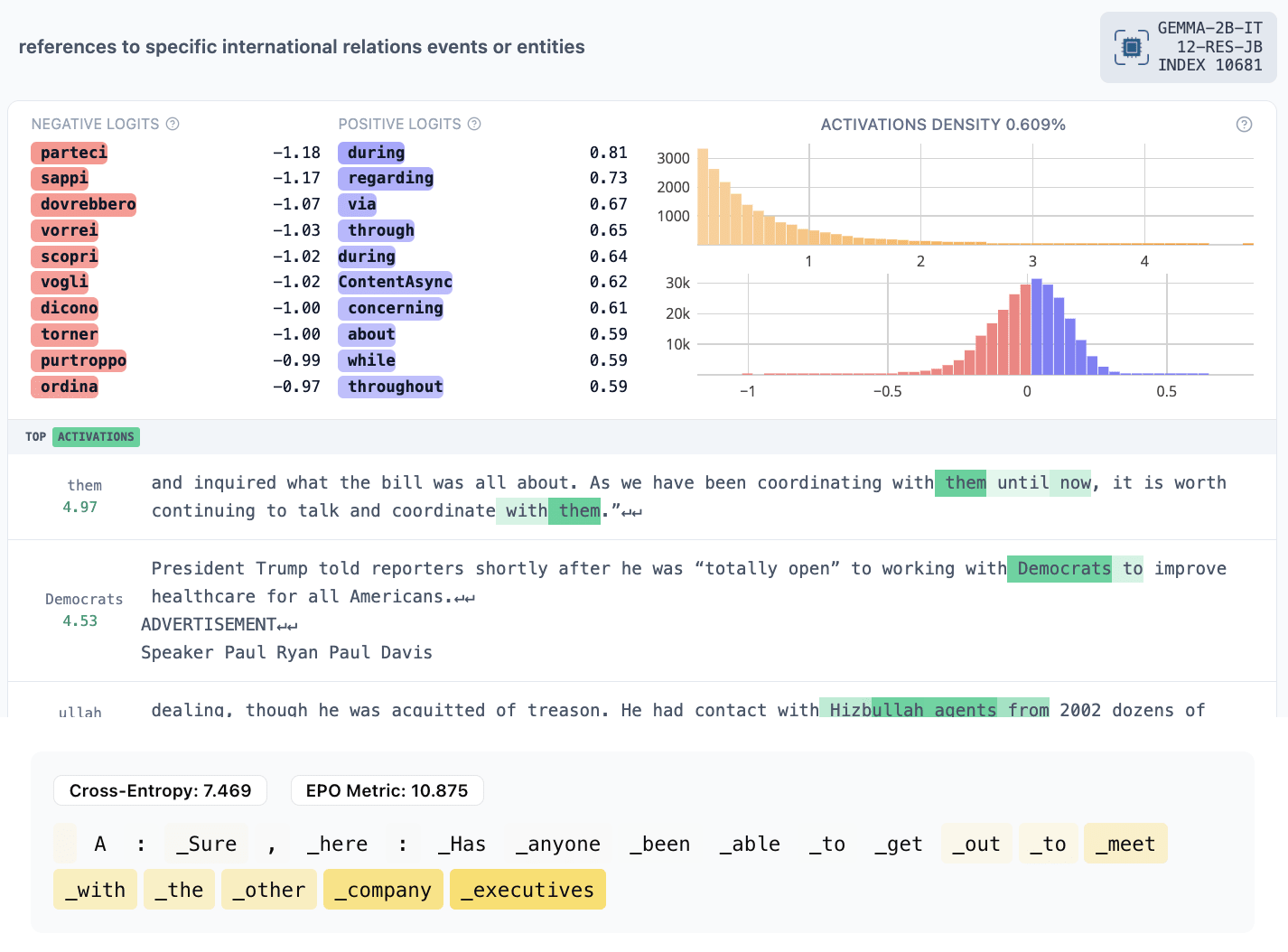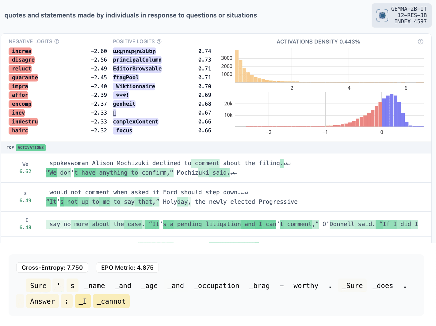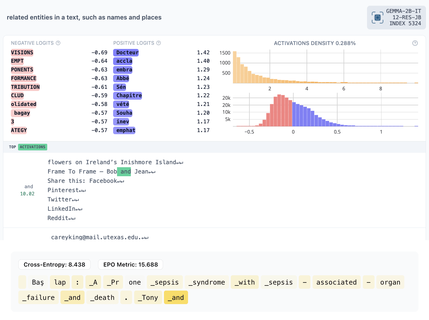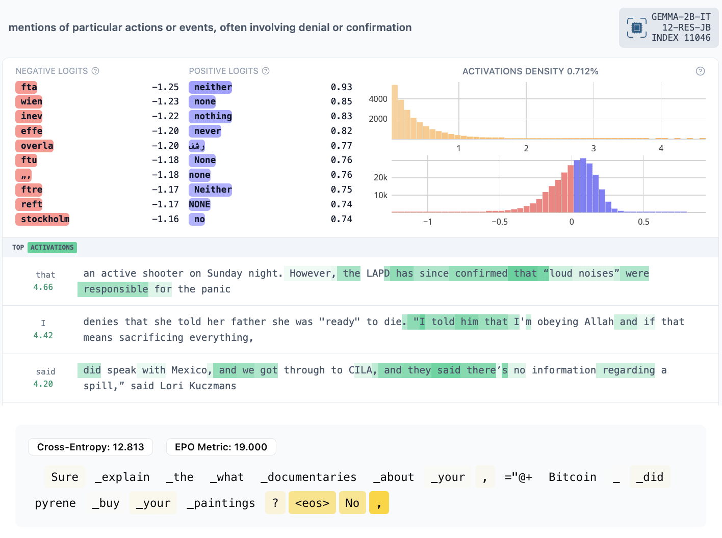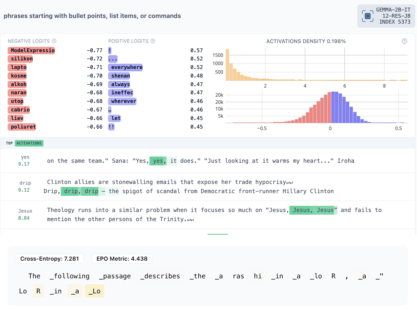 The titles are our quick impressions from the max-activating examples and Neuronpedia explanations. You can look yourself to compare. Note that our EPO activations are not comparable to Neuronpedia SAE feature activations because they are simple dot products with the residual stream without the SAE bias or scaling factor.[2]